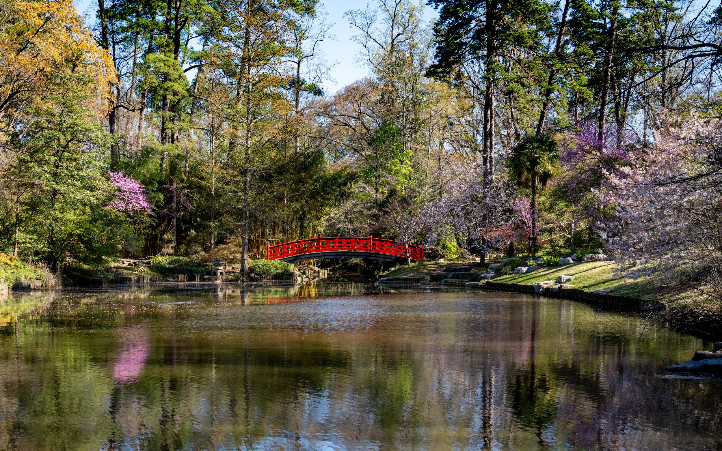 The entrance leads to a circular rose garden with a magnificent fountain in the center. A path to the right of the fountain leads to a pond with thoughtfully placed benches and scenic spots to stop and enjoy for a moment or longer. Of course, ducks are always paddling their way from one point or another out on the pond. The path offers views of a beautiful red arched bridge, offering access to the far side of the pond. People love to stop on the bridge for photo opportunities or just to enjoy the moment. Being surrounded by nature, and artisticly designed garden features and architecture, it’s easy to feel like you’re in a Claude Monet painting.